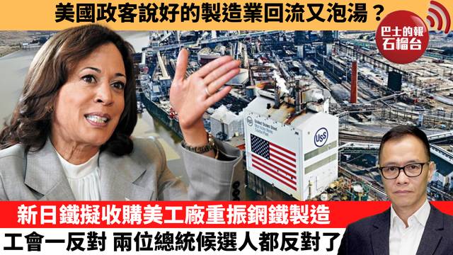 盧永雄「時事快評」美國政客說好的製造業回流又泡湯? 新日鐵擬收購美工廠重振龬鐵製造,工會一反對 兩位總統候選人都反對了。 24年9月4日 (盧永雄)